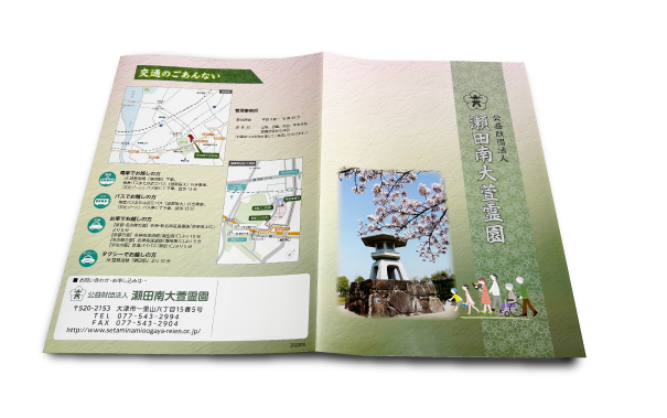 瀬田南大萱霊園は、滋賀県大津市の東部、県営公園文化ゾーンに連なる平地のお参りしやすい霊園です。 園内は四季の移ろいと潤いの感じられる修景配置によって「市民の憩いの場」と、「墓地としてのやすらぎの場」が並存する緑豊かな公園墓地となっております。 駐車場完備。 宗旨・宗派不問でお参りいただきやすい霊園施設です。